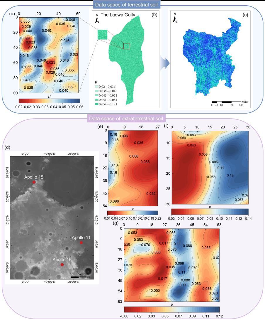 课题组将不同物理化学环境下的成土过程概化为分形破碎、随机碰撞和聚合,实现了地球土壤、月壤、火星土壤的颗粒分布的随机过程模拟。研究确立了统一的颗粒土壤粒径分布(GSD)函数P(D) = g(μ)D-μexp(-D/Dc),将土体颗粒特征约化为参数(μ,Dc),从而将土体可化为参数的随机颗粒场,为实现土壤参数从样本尺度向区域尺度的提升提供了理论工具。研究结果自然引出一种新的土壤研究的GSD范式,即用随时空逐点变化的GSD参数替代(或补充)传统土壤-景观范式的平均化区域性参数,将为局域地表(月表)过程和区域性演化的动力学提供新的数据基础。GSD的统一性还为月壤模拟样本实验和行星原位资源利用(ISRU)提供了新的思路。