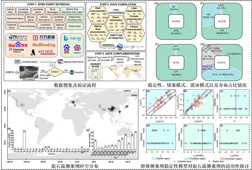 针对这一问题,胡凯衡研究员团队历时两年取得重要进展。研究团队通过多源异构数据融合策略,系统检索了2519份学术文献、政府调查报告及权威媒体报道,结合Google Earth遥感影像的时空数据校验,成功构建全球首个泥石流堰塞坝多维度数据库。该数据库涵盖1800-2023年间全球555处典型泥石流堰塞坝案例,完整收录地理坐标、形态参数(坝长/高/宽/体积)、堵江模式、稳定状态、寿命周期、堰塞湖特征(长度/库容/面积)、溃决参数(峰值流量)及环境要素(温度/降雨)等38项核心属性数据。基于此数据库,研究团队发现泥石流堰塞坝呈现69.8%的高完全堵塞率,漫顶溃决占比高达98%,显著区别于其他类型堰塞坝;坝体平均寿命仅1.4年,73%的案例在成坝一年内失稳破坏,且同一沟道重复暴发泥石流、堵河成坝的现象频发。同时,团队还系统评估了传统滑坡堰塞坝评估模型对泥石流堰塞坝的适用边界。