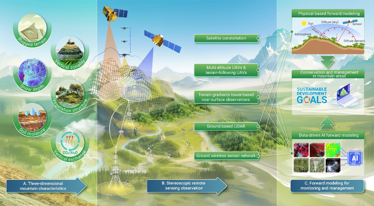 针对该问题,近日,中国科学院成都山地灾害与环境研究所李爱农研究员、边金虎副研究员在 Cell 旗下综合国际期刊 The Innovation 发表了题为“Stereoscopic remote sensing observation for mountains: Advancing monitoring, modeling, and management”的研究成果。该研究从山地立体特征、遥感观测技术、山地遥感前向建模三个方面系统探讨了山地遥感立体观测内涵,并指出山地立体特征要求遥感观测具备稳健的时空表征能力,发展考虑山地特征的优化采样技术和时空尺度扩展模型可有效提高山地地面观测的时空代表性。无人机山地仿地飞行技术和地形校正模型进一步增强了山区无人机观测和卫星观测的时空谱一致性。基于立体观测的山地遥感前向建模能有效提升对山地地表过程的理解,通过山地三维真实场景重建,服务山地辐射传输过程精细模拟和山地遥感机理模型发展。