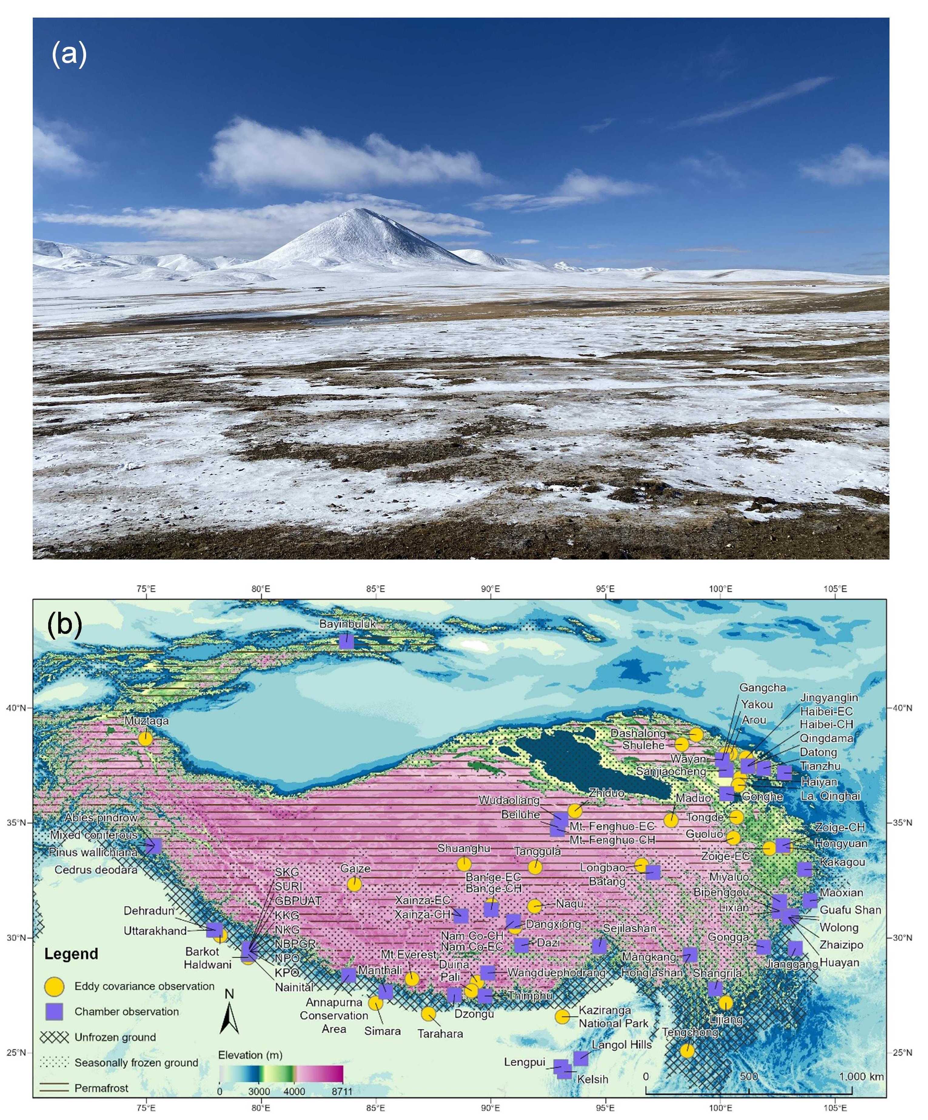 青藏高原高山和极高山广布,高山冻土中蕴藏大量有机碳,在气候变暖影响下可能存在分解风险。尤其是,越冷的地区碳排放对温度变化可能更敏感。然而,以涡度相关系统为代表的测定手段很难区分植物排放和冻土CO2排放。非生长季,植物处于休眠状态,为解析冻土直接CO2排放提供了独特的“窗口期”。成都山地所研究团队通过强化羌塘高原碳通量监测并开展数据整合,对青藏高原及周边地区非生长季CO2排放的海拔模式开展了系统研究。