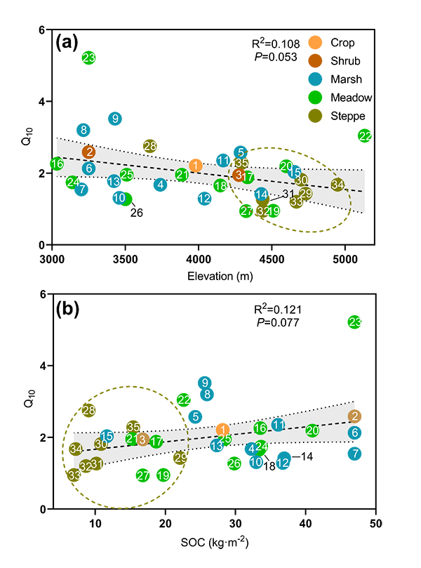 研究表明,土壤CO2排放量随海拔升高而显著下降,其海拔模式由土壤有机碳决定。CO2排放的温度敏感性同样随海拔升高而降低,这一海拔模式同样由土壤有机碳决定——这一发现与此前预期有所差异。到本世纪末,4000米以上地区CO2排放增幅显著低于较为温暖的低海拔地区,也显著低于北极地区。因此,底物供应是决定青藏高原冻土CO2排放强度和释放潜力的关键。以羌塘高原为代表的连续多年冻土区土壤有机质有限,导致CO2释放受限,这印证了此前研究团队提出的“植物主导青藏高原碳反馈”的观点。“海拔越高>>>底物供应越有限>>>碳排放对气候变暖反应越弱”,这一科学发现为高山冻土碳循环的预测提供了关键的科学依据。