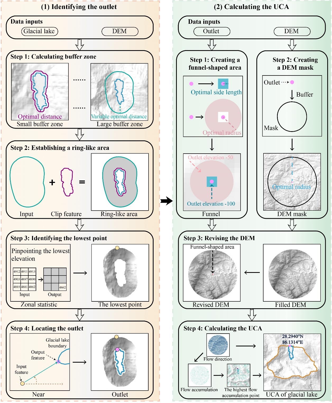 针对这一关键问题,成都山地研究所聂勇研究员团队提出了一种新型冰湖出水口及上游汇水区自动定位方法。基于该方法确定的冰湖出水口位置,研究团队进一步开发了人工漏斗模型,并结合数字高程模型(DEM)数据精确控制水流路径,从而实现对冰湖上游汇水区的有效提取。该研究以四个典型流域案例为基础,系统识别了潜在危险性冰湖,旨在验证所提出方法的有效性。实验结果表明,该方法能够准确识别冰湖出水口与上游汇水区。此外,该方法不仅能够有效区分冰湖与非冰湖的出水口特征,还具备灵活提取任意指定地理位置上游流域的能力。相较于现有方法,在提升冰湖出水口提取精度及上游流域识别精度的同时,该方法显著降低了计算时间成本。因此,在水文研究领域中具有广泛的应用前景,并在评估复杂冰缘环境中冰湖灾害风险方面展现出显著的应用价值与实用价值。