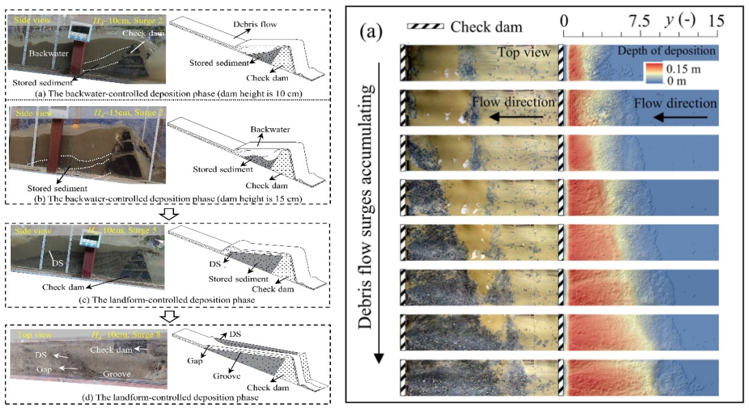 针对上述问题,中国科学院成都山地灾害与环境研究所陈剑刚研究员团队联合云南东川泥石流观测研究站,通过多阵次泥石流物理模型实验,开展了拦砂坝库区淤积地貌演化规律及其对泥沙拦淤效率的调控机制研究。研究表明,拦砂坝建成初期(回淤控制阶段),坝后回淤效应显著,拦淤过程受水力消能作用影响,拦淤效率最高,拦砂率约80%;随着淤积的发展,淤积体纵坡等地貌特征逐渐发挥调控作用(地貌控制阶段),拦淤作用逐渐衰减,拦砂率以约10%每淤积单位的速率衰减;当拦砂坝淤满,其顶部逐渐形成稳定过流通道(准平衡阶段),拦砂率降至接近零点。进一步建立了基于物理过程的拦淤量与拦砂率演变的参数化模型。