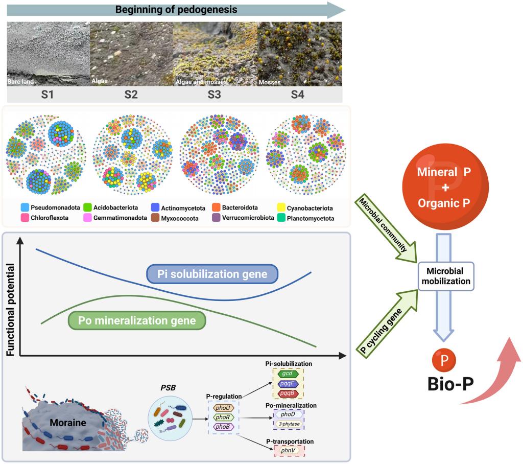 该研究阐明了成土初期微生物促进磷有效性提升的机制,明确了关键类群与功能基因在不同阶段的作用路径,为理解冰川退缩区等极端环境中养分循环的分子机制提供了关键证据,并为高山生态系统原生演替与恢复管理提供了重要科学依据。