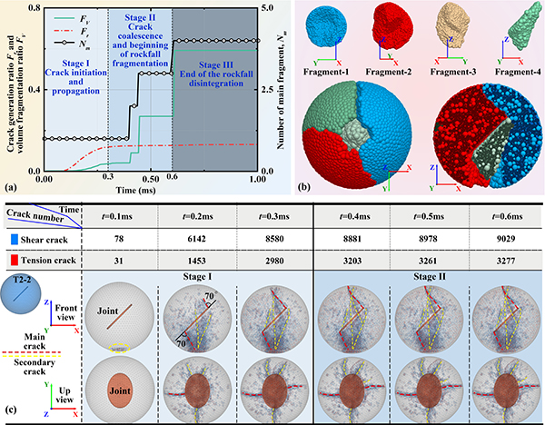 (a)Nm、Fr 和 FV 随时间的变化情况 (b)岩崩的分解过程及其碎片 (c)岩崩样本在撞击过程中裂缝数量的变化情况