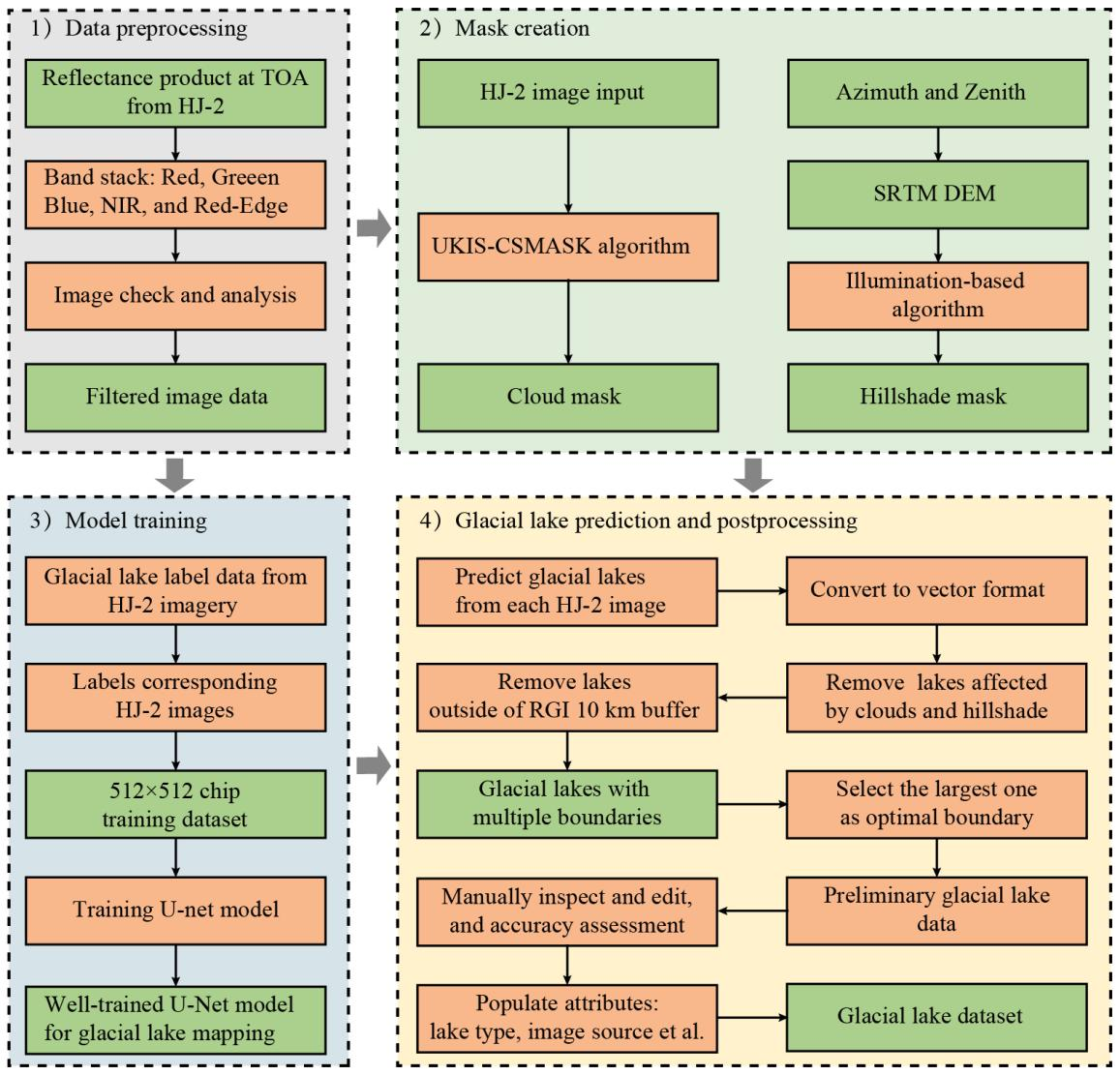 为应对上述挑战,中国科学院成都山地灾害与环境研究所聂勇研究员团队携手应急管理部国家减灾中心以及英国南极调查局的专家,基于国产环境减灾二号(HJ-2A/B)卫星数据,开发了一种依托高重访频率卫星影像的区域冰湖自动化制图技术。该研究充分利用 HJ-2A/B 卫星的高时间分辨率优势,将人工智能深度学习方法与遥感影像处理算法有机结合,成功实现了中喜马拉雅地区冰湖的高效遥感调查与动态监测。这一成果为破解高山复杂环境下冰湖监测的技术难题提供了新的解决方案。