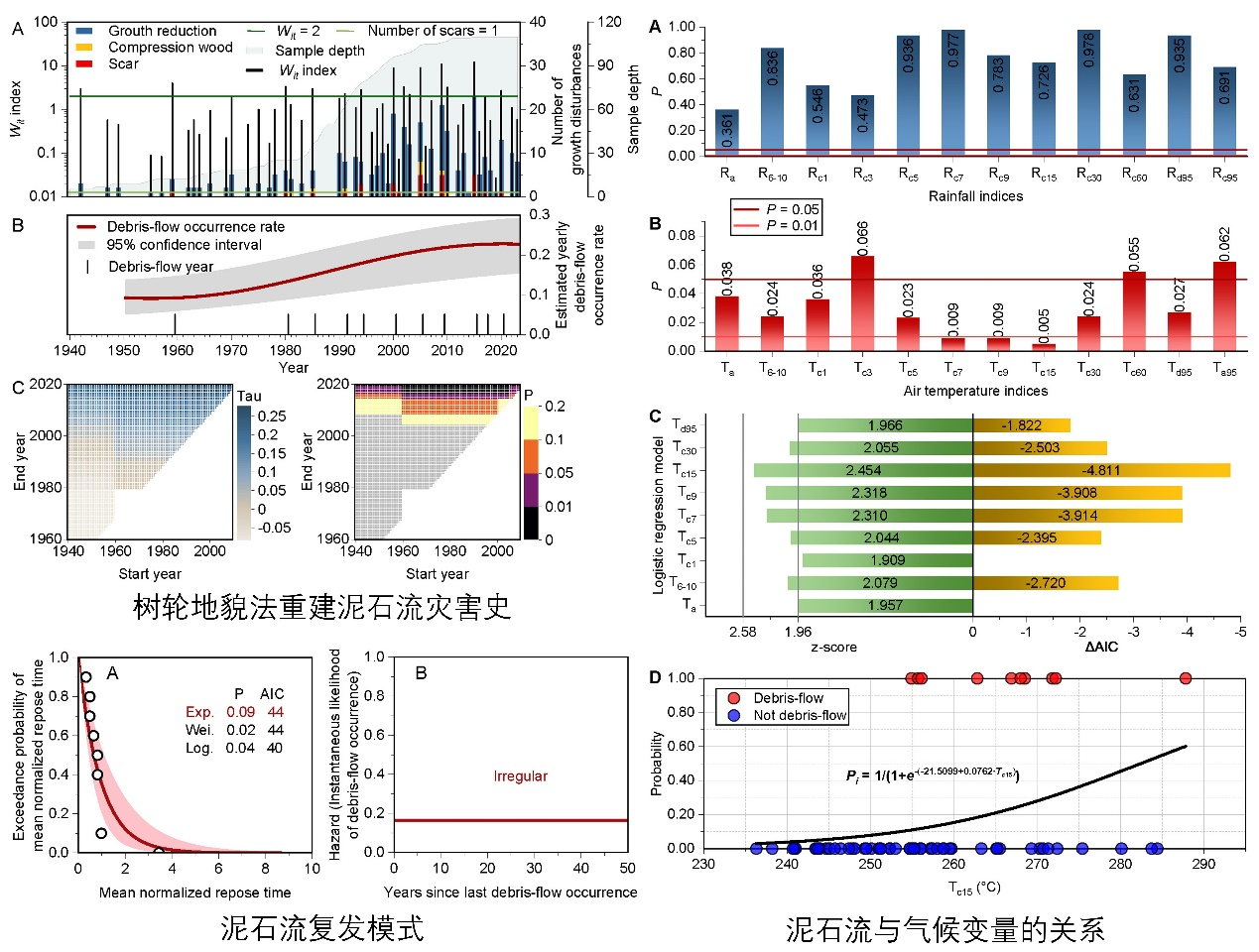 团队以雅江下游典型冰川沟(雪卡沟)为对象,综合树轮地貌学、多源遥感、高精度地形测量及气象统计等方法,采集并分析了110棵泥石流扰动木和32棵标准木的年轮,识别出1940年至今的11次泥石流事件,重建了冰水泥石流活动史。进一步分析发现:泥石流规模虽呈减小趋势,但发生频率从1950年代的每年0.09次显著上升至当前的0.23次。其高频活动在下游沟道和堆积扇造成持续侵蚀与沉积;该沟泥石流属于径流触发型,6-10月最大15日累积正积温与其形成存在强关联性;泥石流复发的间隔时间表现为随机模式,表明其发生主要取决于触发条件而非先前泥石流事件,这与充足的物源供给密切相关。