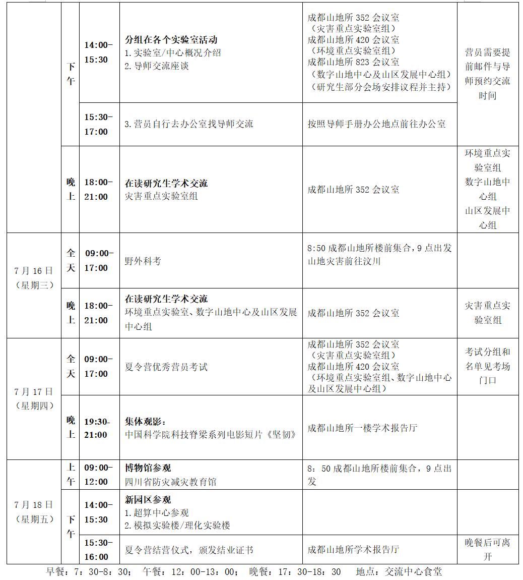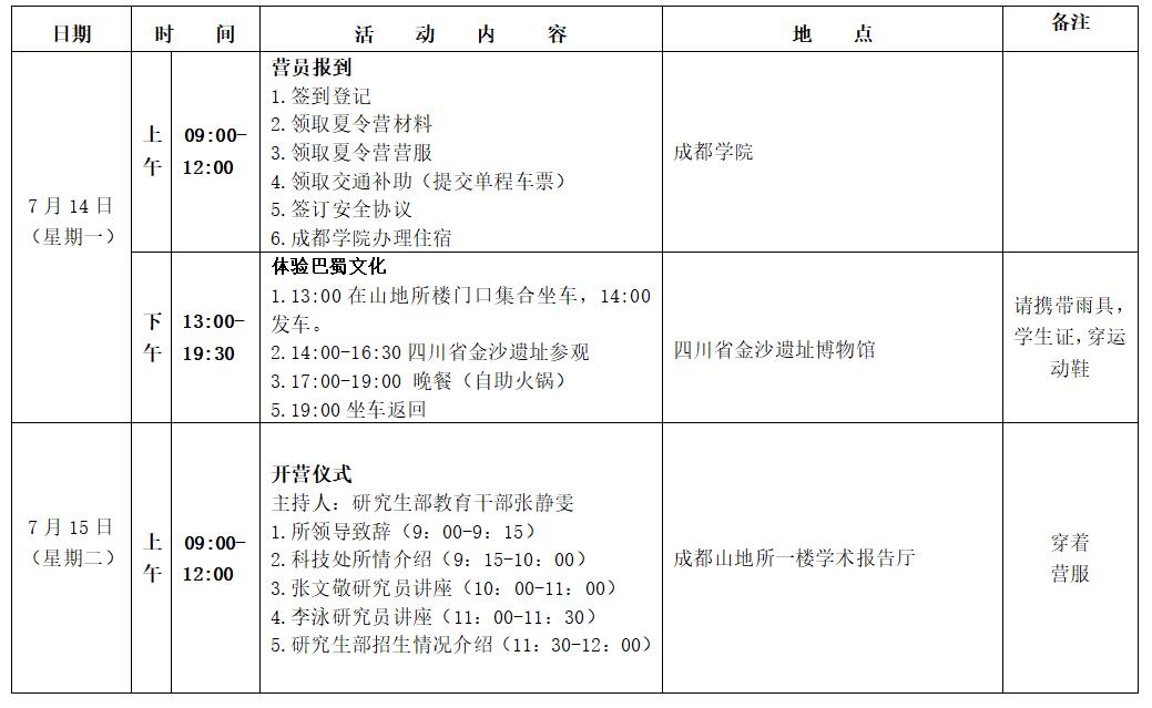 注意:1.成都山地所营员在2025714日上午9:00-12:00中国科学院成都学院报到并办理住宿,请切勿逾时报到,逾时将无法安排。