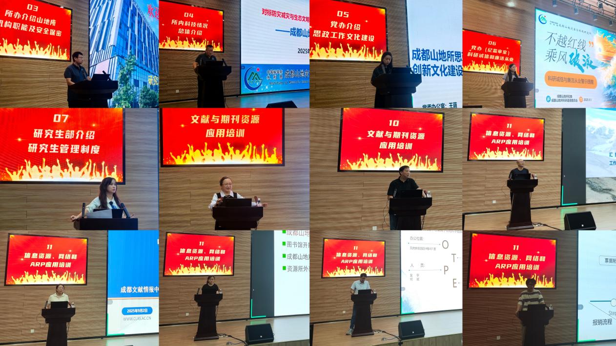 培训期间,所务办公室、党委办公室、科技处、纪监审室及研究生部等部门负责人,分别就研究所管理体系、科技创新与科技管理、安全保密、知识产权、研究生培养、思想政治与创新文化建设、科研诚信、学术规范与廉洁从业等制度进行了系统宣讲,并组织全体新生完成了安全承诺书及知识产权保密协议的签署工作。活动还同步开展了文献资源利用、数据管理、财务报销、因公出国(境)等ARP办公自动化系统应用培训,特邀Journal of Mountain Science及《山地学报》编辑部进行学术论文写作规范及期刊选稿标准专题宣讲。为提升学术能力,邀请周公旦研究员作题为《如何做好学术报告》的专题报告,从研究范式与表达逻辑两个维度提供了专业指导。
