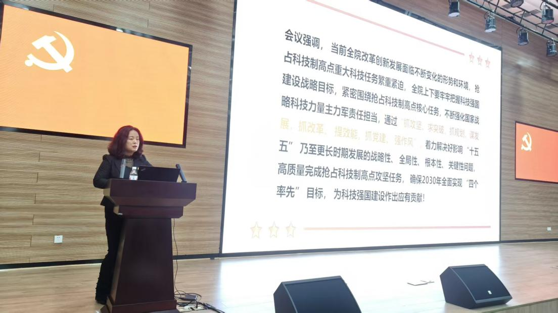 会上,周鹏浩书记以《2025年夏季党组扩大会议精神解读——抢占科技制高点的使命与路径》为题讲授党课。她结合研究生实际,解读了中国科学院夏季党组扩大会议精神,围绕“十五五”发展定位与战略,阐释“科技自立自强”要求,引导研究生党员明确科研报国的职责和使命。