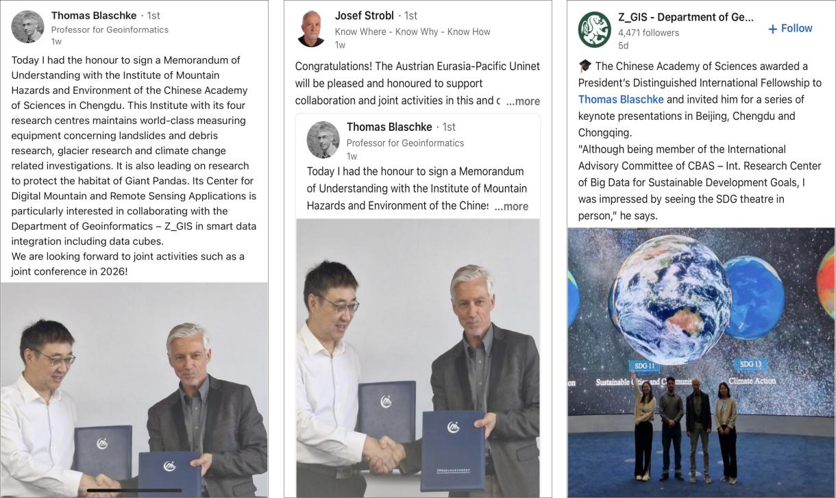 Thomas教授的访问信息被他本人、同事及所在大学在LinkedIn等国际平台上广泛传播。此次PIFI项目的圆满执行不仅拓展了科研人员前瞻性的研究视野,优化了青年学者的培养体系,提升了成都山地所山地系统科学研究和数字山地研究领域的国际影响力。双方还将以本次项目作为契机,不断推进本所与国外知名研究单位之间的国际合作与交流,推动遥感领域的创新发展,通过持续开展科技合作与人才培养,加速我所国际化的步伐。