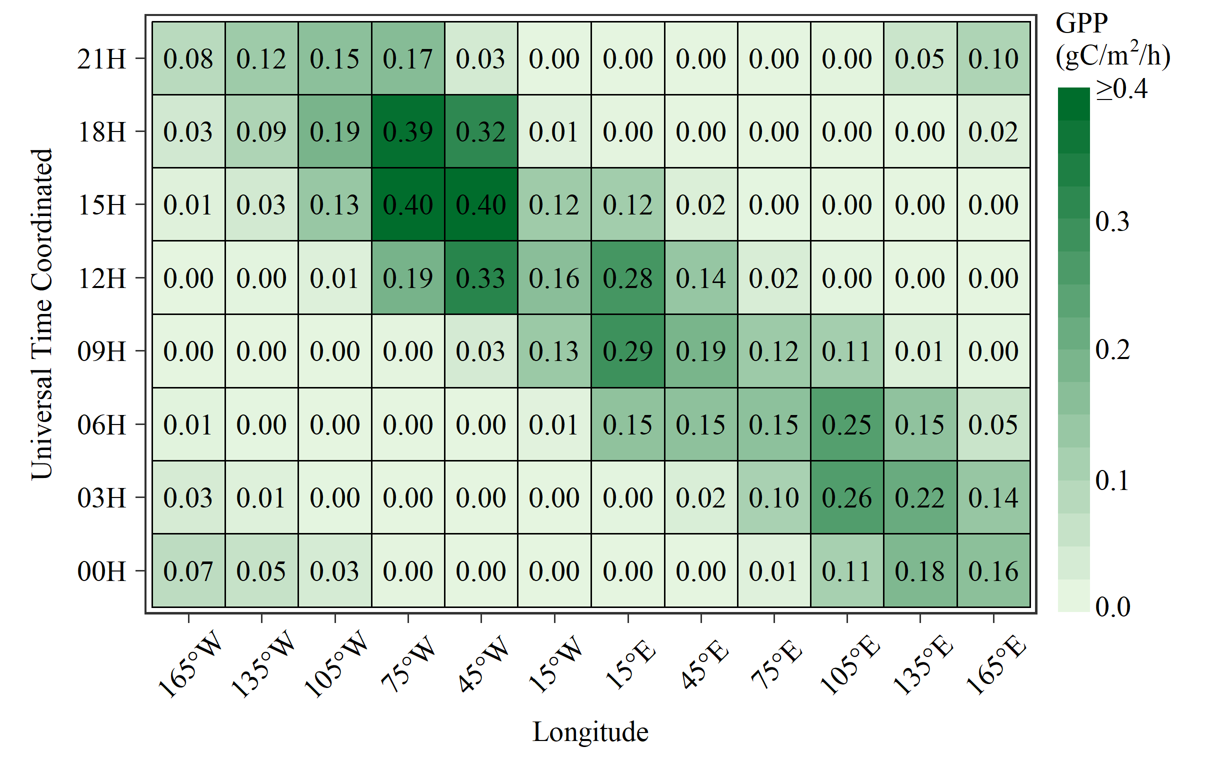 该数据集揭示了全球GPP在小时尺度下的波动幅度可达到约0.10 gC/m²/h,为深入分析碳通量在短时尺度上的动态变化提供了重要依据。基于该数据集,全球GPP年总值约为124.77 PgC,略低于基于8天时间分辨率的同类GPP产品(126.92 PgC)。这种差异主要源于模型在使用较粗时间尺度进行计算时,通常会平滑极端环境胁迫事件,导致GPP估算值偏高。相比之下,小时尺度的模拟过程能够更好地捕捉这些极端胁迫事件的影响,从而提供更为精准的GPP估算。
